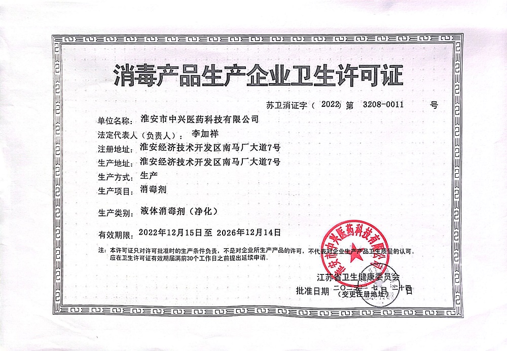 消毒產(chǎn)品生產(chǎn)企業(yè)衛(wèi)生許可證