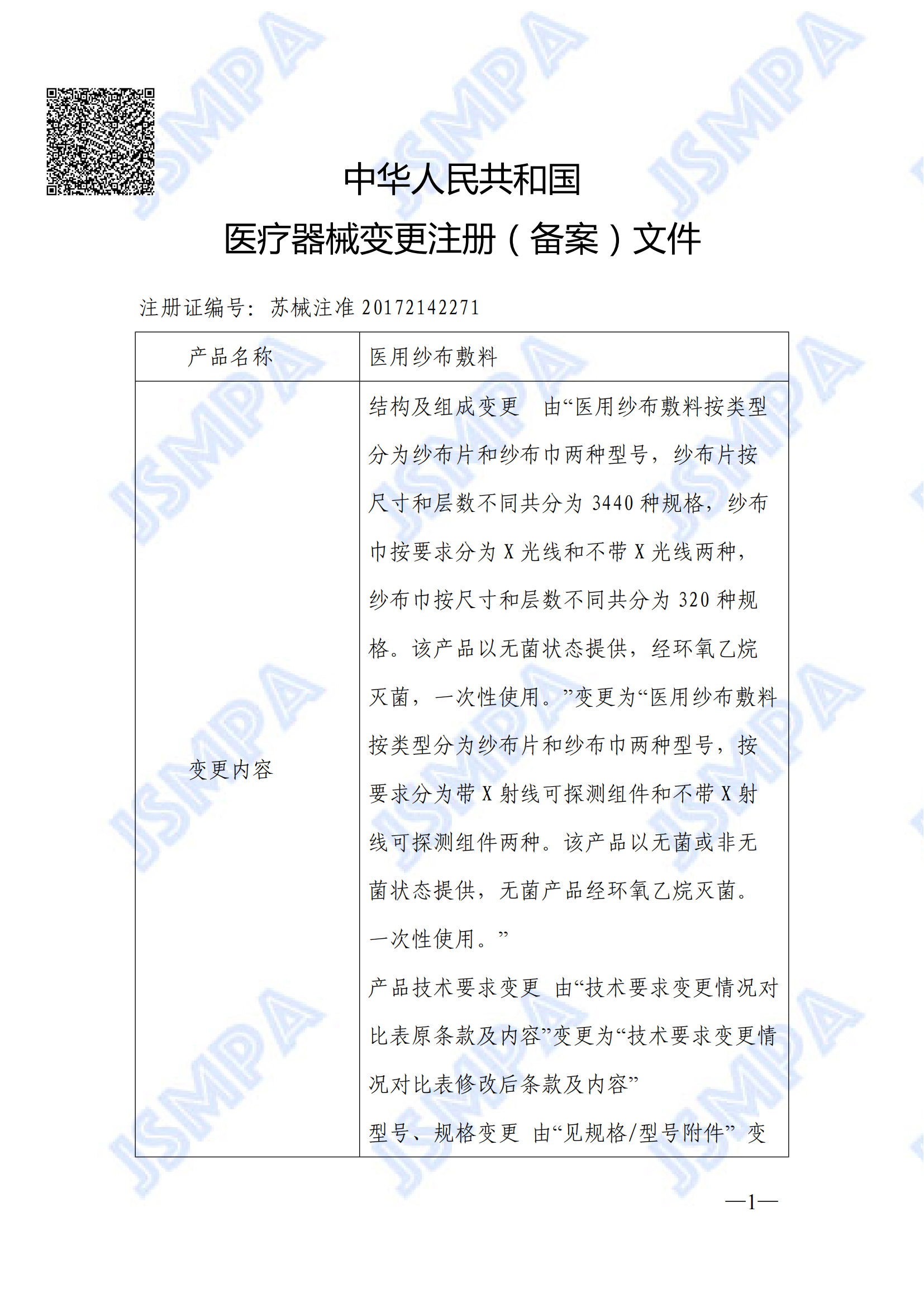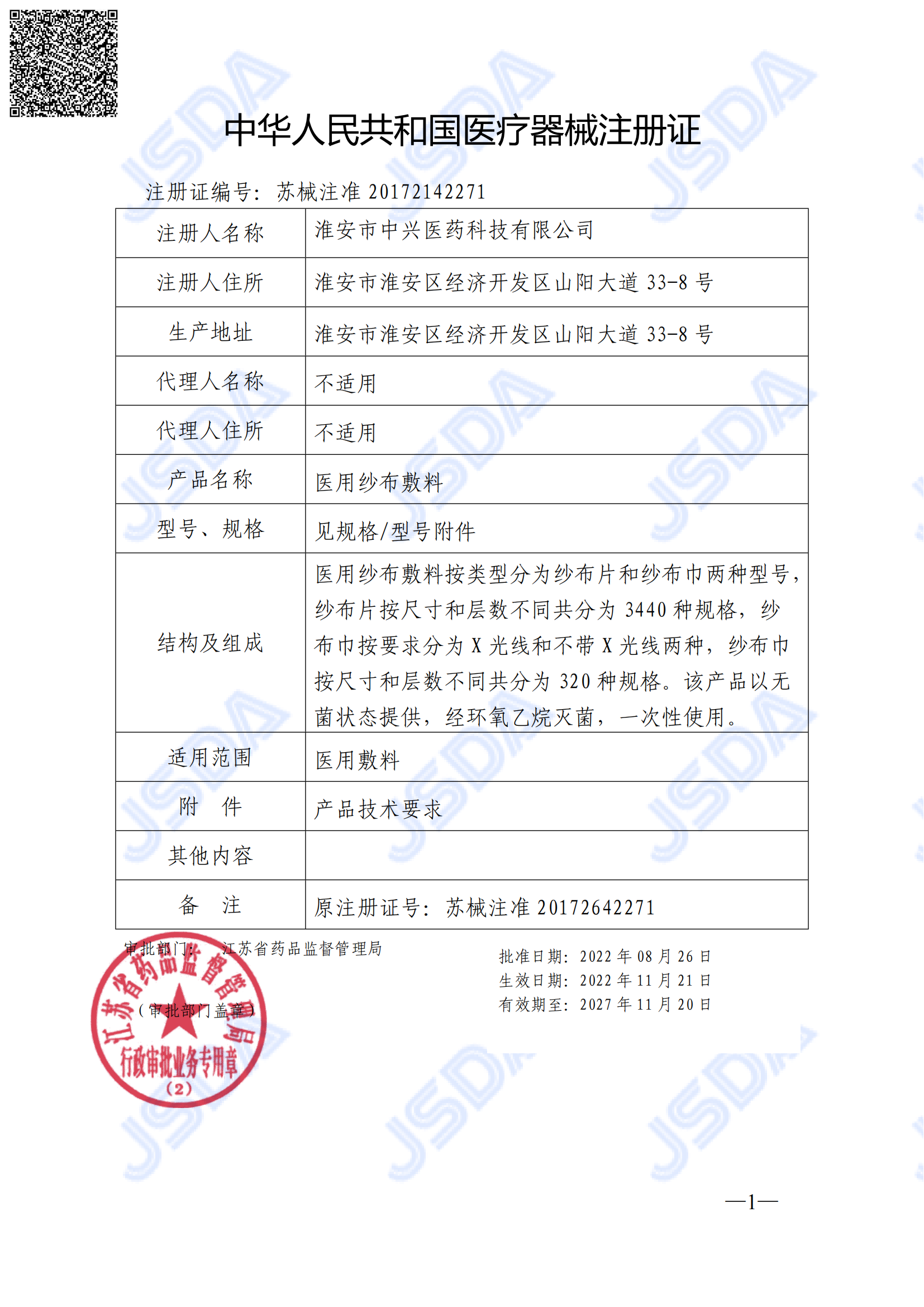 醫(yī)療器械注冊(cè)證(醫(yī)用紗布敷料注冊(cè)證)